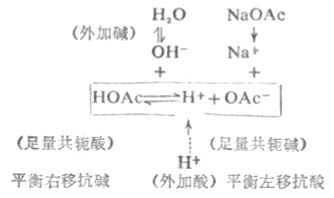 在缓冲溶液中加入少量强碱(如NaOH),则增加了溶液中OH-的浓度。假设不发生其他反应,溶液的PH值应该增大。但由于溶液中的H+立即加入的OH-结合成更难离解的H2O,这就破坏了HOAc原有的离解平衡,促使HOAc的离解平衡向右移动,即不断向生成H+和OAc-的方向移动 ,直至加入的OH-绝大部分转变成H2O,建立新的平衡为止。因为加入的OH-少,溶液中抗碱成分即共轭酸HOAc的浓度较大,因此溶液的PH值不发生明显升高。
