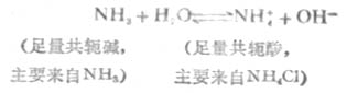 弱碱及其对应盐的缓冲作用原理,例如,NH3-NH4CL(即NH3-NH+4)溶液中,NH3能对抗外加酸的影响是抗酸成分,NH+4能对抗外加碱的影响是抗碱成分。前者通过下述平衡向右移动而抗酸,后者通过平衡向左移动而抗碱,从而使溶液的PH值稳定。