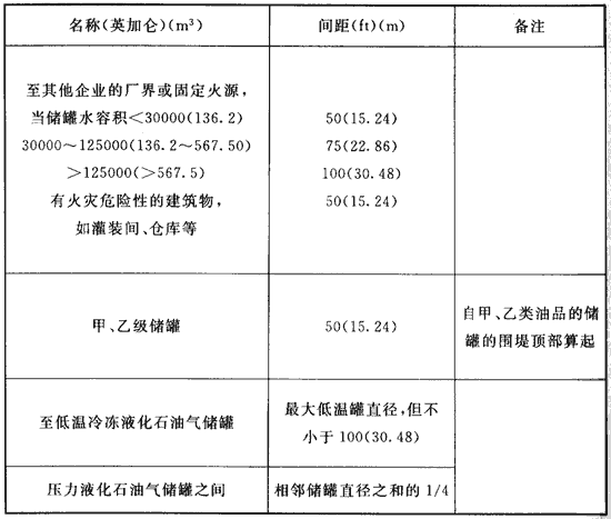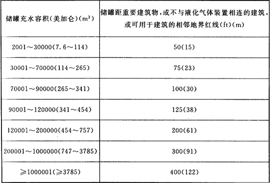 注:储罐与用气厂房的间距可按上表减少50%,但不得低于50ft(15m)。表中数字后括号内的数值为按公制单位换算值。1美加仑=3.79×10-3m3。