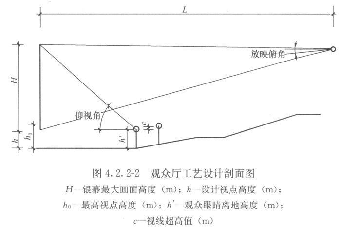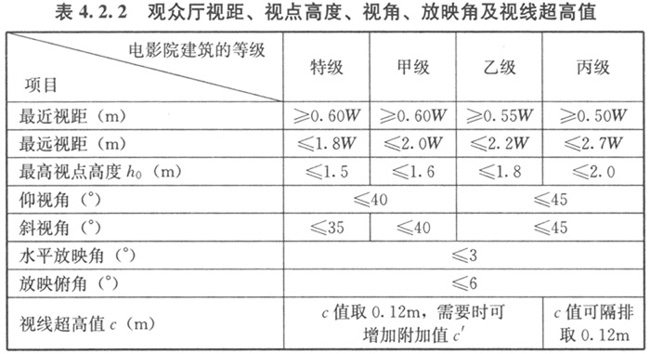 4.2.2 观众厅视距、视点高度、视角、放映角及视线超高值,应符合表4.2.2的规定(图4.2.2-1、图4.2.2-2)。