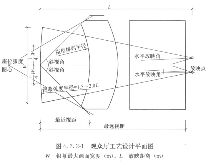 6 宽银幕在水平方向呈弧面设计时,其曲率半径宜为放映距离L的1.5~2倍(图4.2.2-1)。银幕弧面中点至幕后的墙面距离不宜小于1.2m。当放映距离和银幕宽度的比值大于1.5且银幕宽度不超过10m时,银幕可为平面,银幕至幕后的墙面距离不宜小于1.0m。