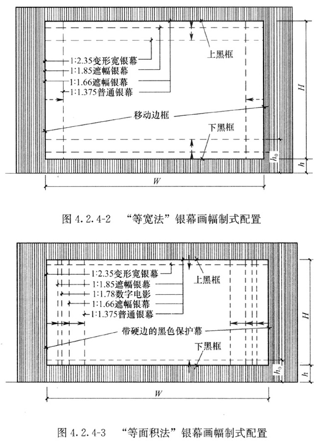 1) 宽银幕和遮幅幕的面积宜相等,高度可根据画幅高宽比调整(图4.2.4-3);