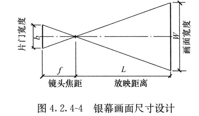 4 银幕画面宽度应由放映距离与放映机片门、放映镜头焦距之间的比例关系(图4.2.4-4)确定。普通银幕画面宽度和变形宽银幕画面宽度可分别按式4.2.4-1和式4.2.4-2计算。
