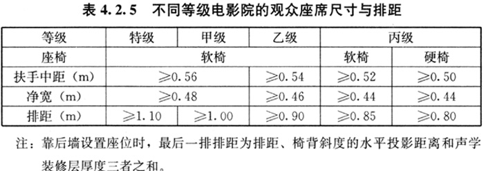 4.2.5 不同等级电影院的观众座席尺寸与排距宜符合表4.2.5的规定。